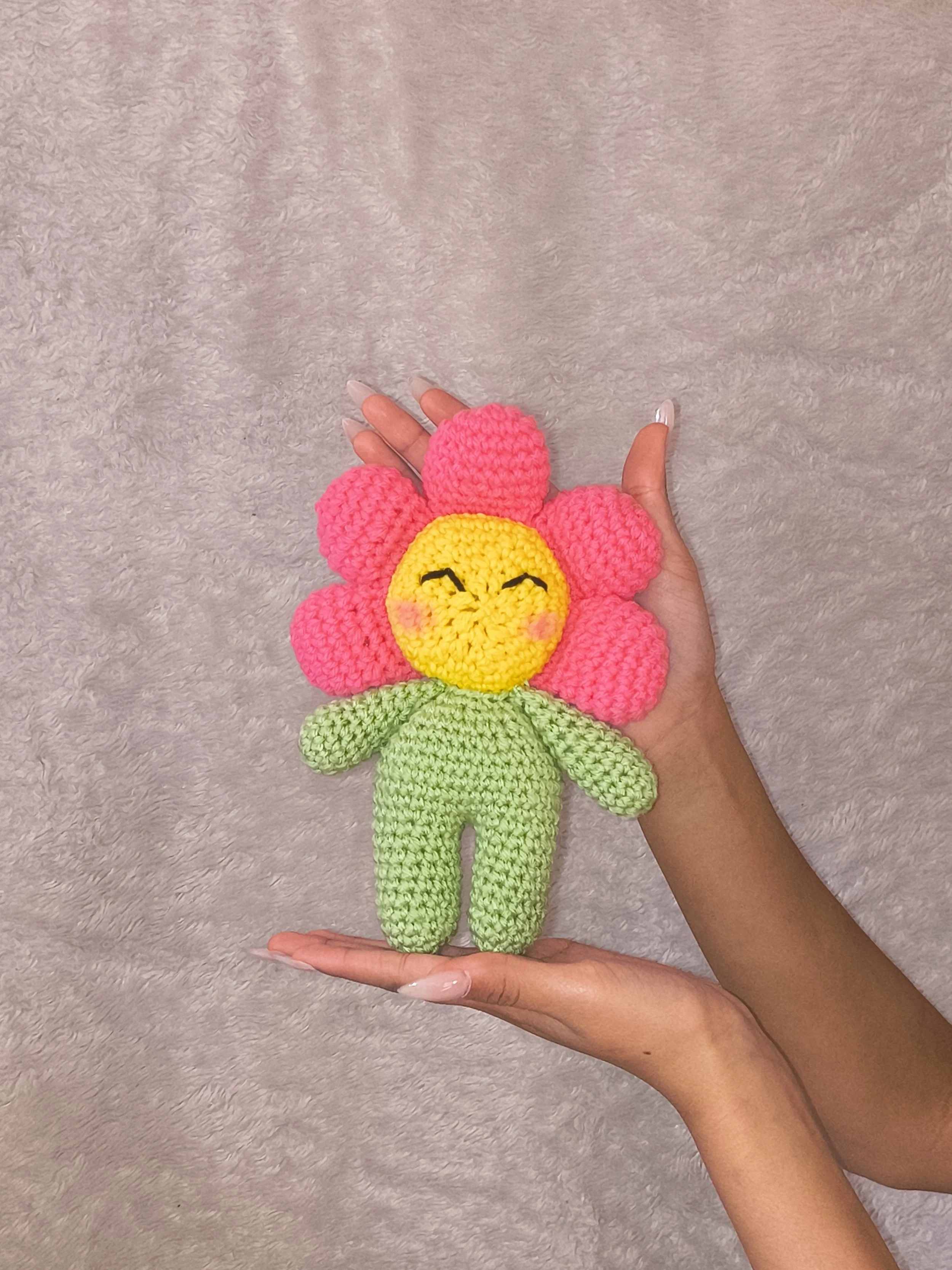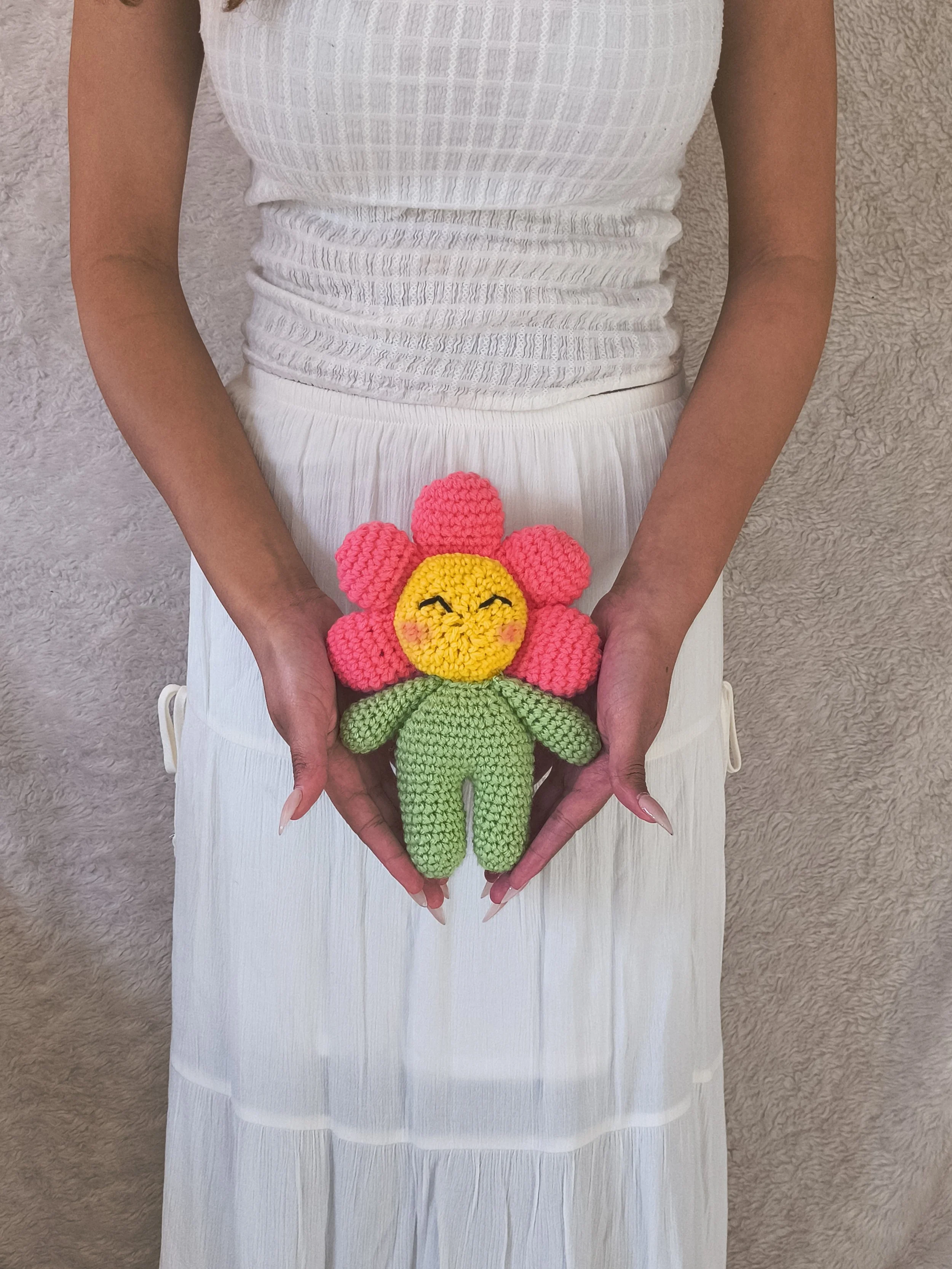 A cheerful, handmade crochet flower doll designed to brighten any space. Featuring soft, textured yarn in vibrant pink, yellow, and green, this adorable plush brings a touch of warmth and personality wherever it goes. Perfect as a unique gift, décor piece, or comforting companion, each piece is crafted with care for a one-of-a-kind feel.